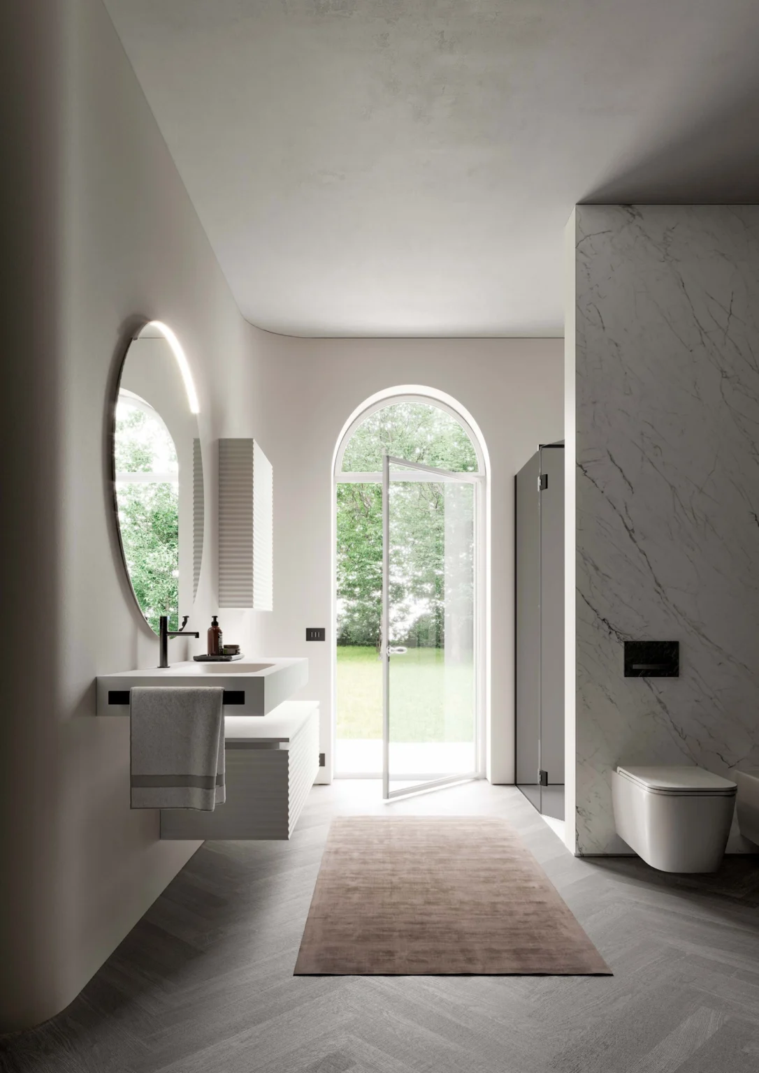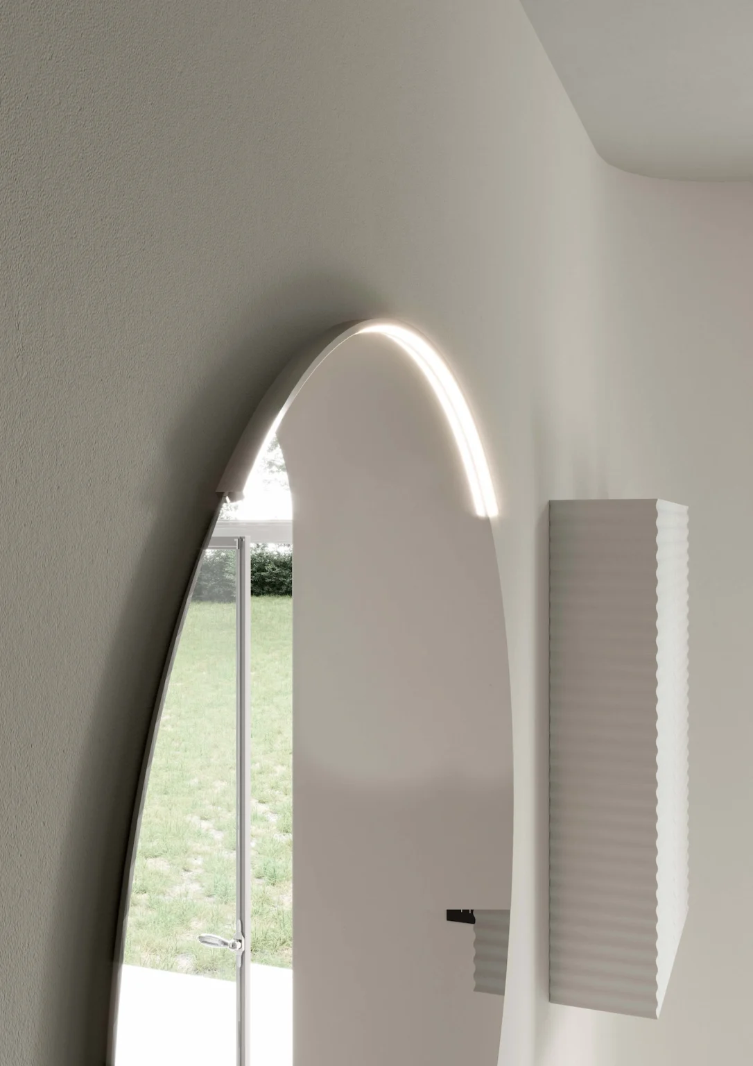 Lampe Arko installable sur les miroirs de la série Lap. Munie d’éclairage LED. IP44 – 3000 K ou 4000 K De 6 à 12 W – de 650 à 1350 Lm