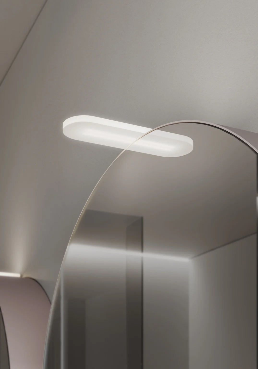 Lampe Muse en Méthacrylate (avec support en acier), installable sur les armoires miroirs Arena et Giotto. Munie d’éclairage LED. IP44 – 4000 K (sur demande 3000 K)