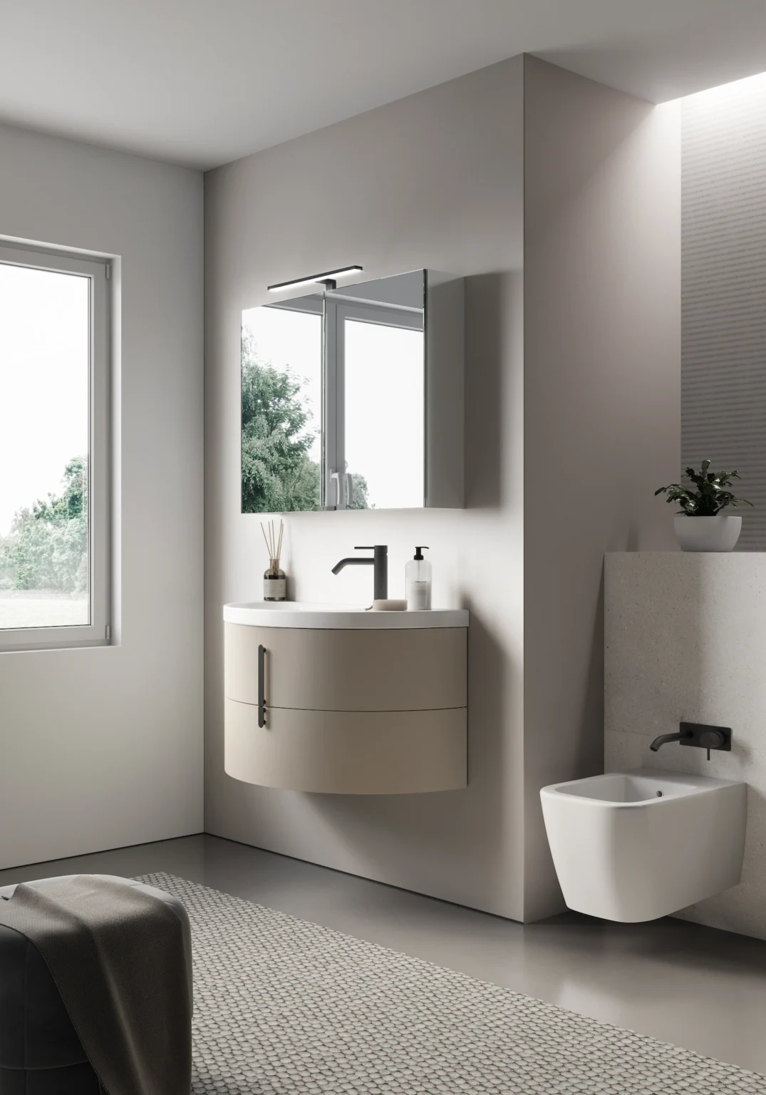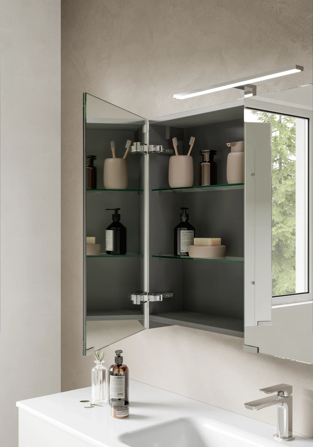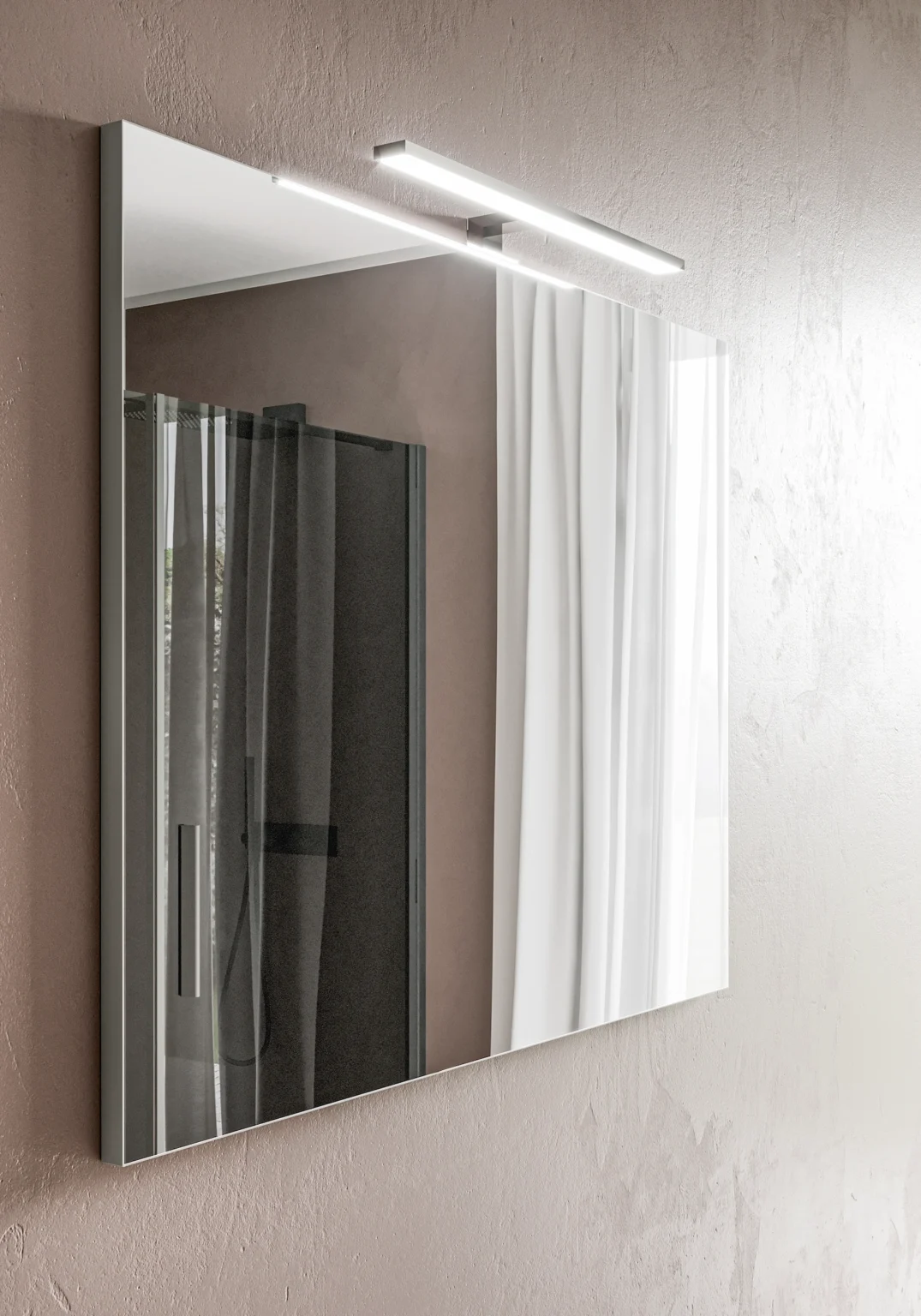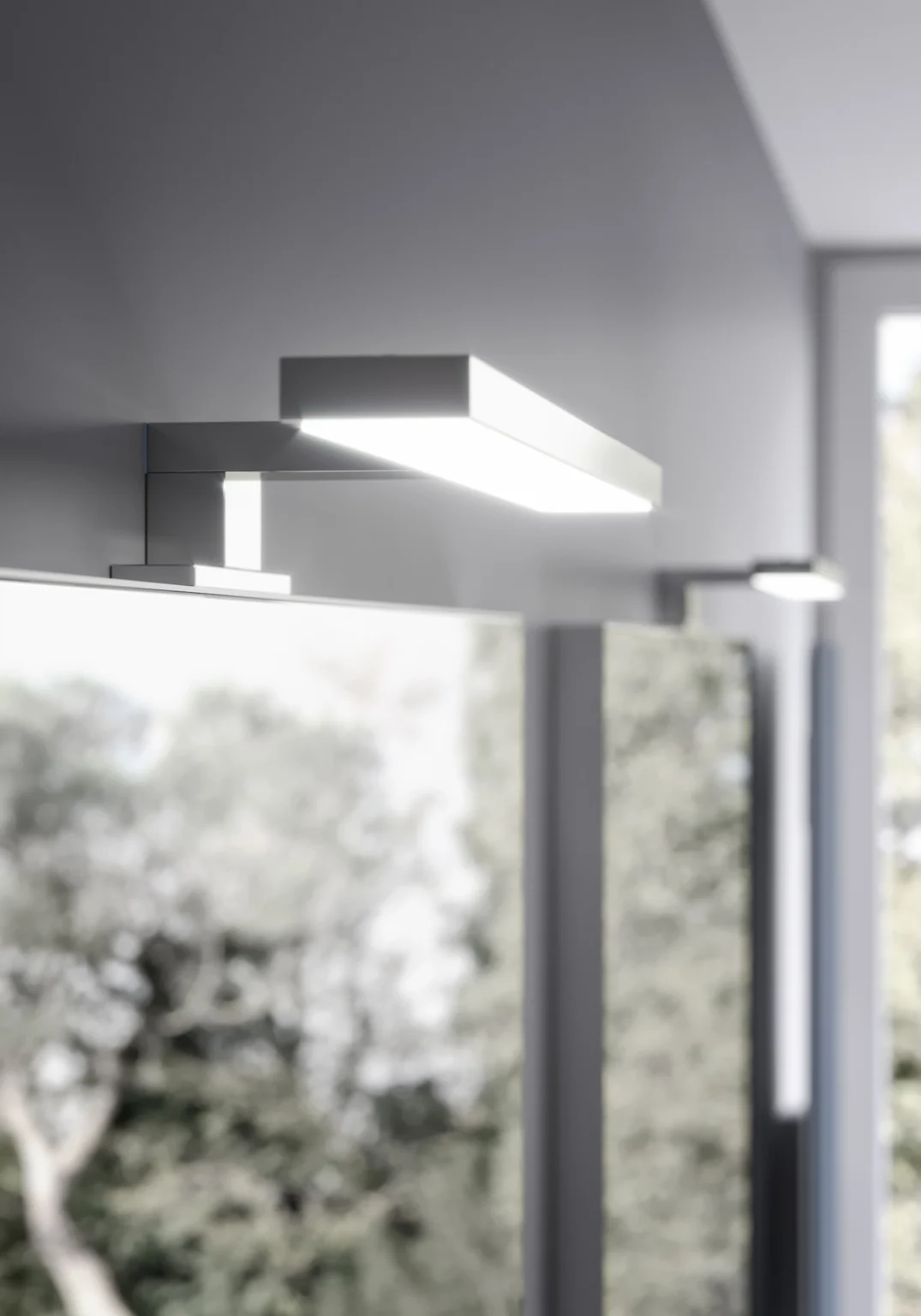 Lampe Web installable sur les miroirs Elma, Elmas, Sat/Sal et les armoires murales à miroir double face. Munie d’éclairage LED. IP44 – 3000 K ou 4000 K De 4,9 à 7 W – de 477 à 720 Lm