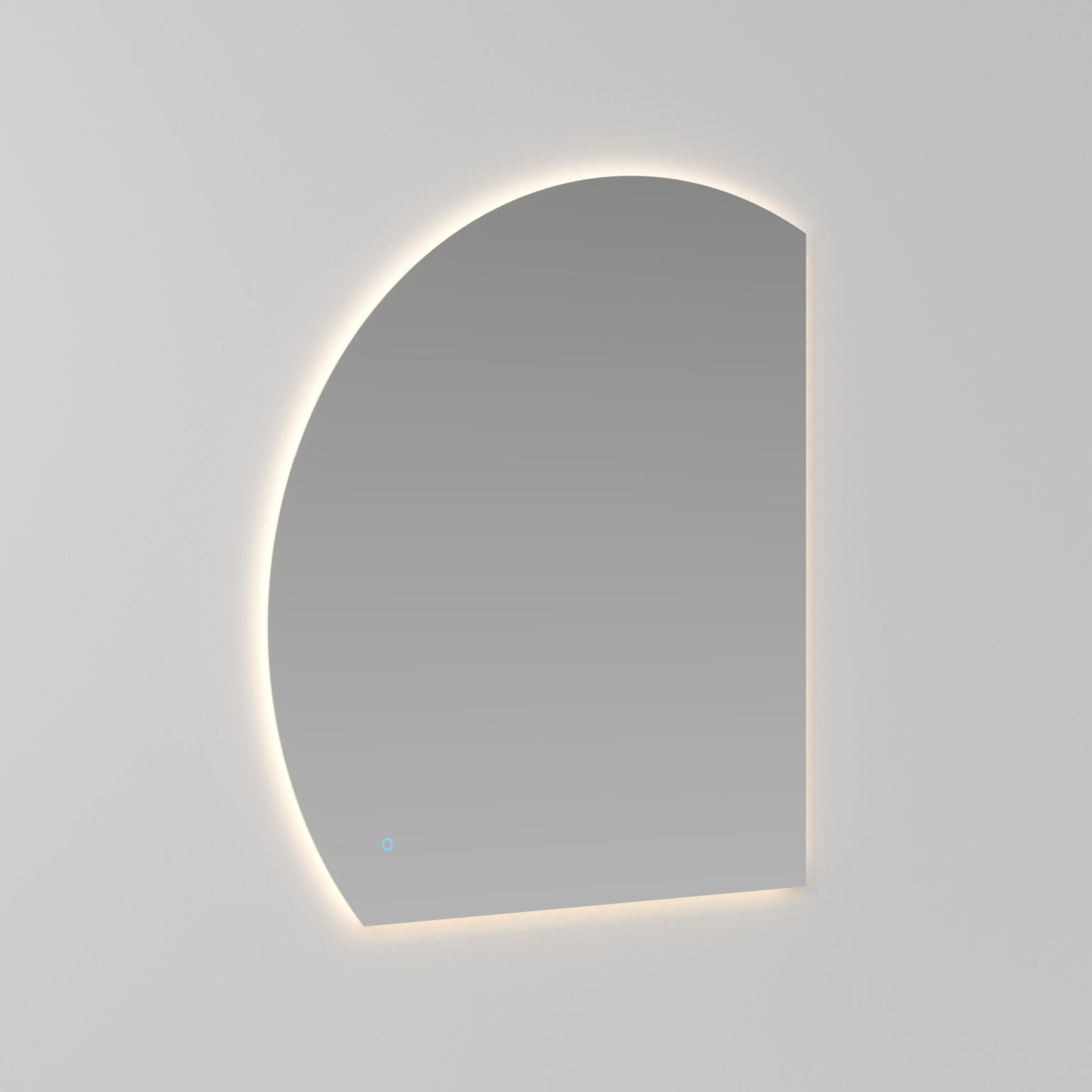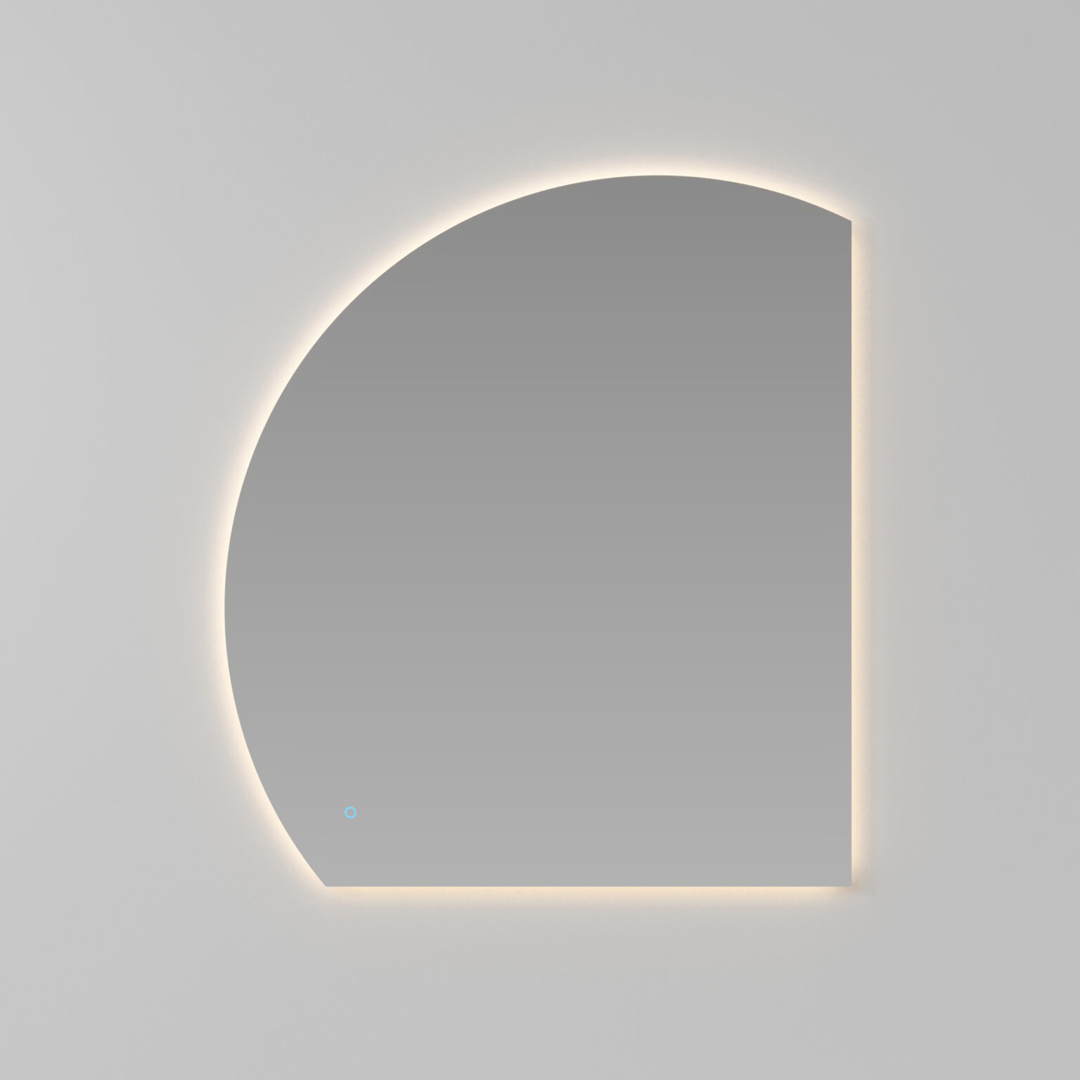 Miroir profilé Ninfea avec bords ronds polis. Configurable droite ou gauche. Avec rétroéclairage LED. Compatible uniquement avec les lampes Arko 140 et Scarlet. IP55 – 3000 K ou 4000 K 27,3 W – 919 Lm
