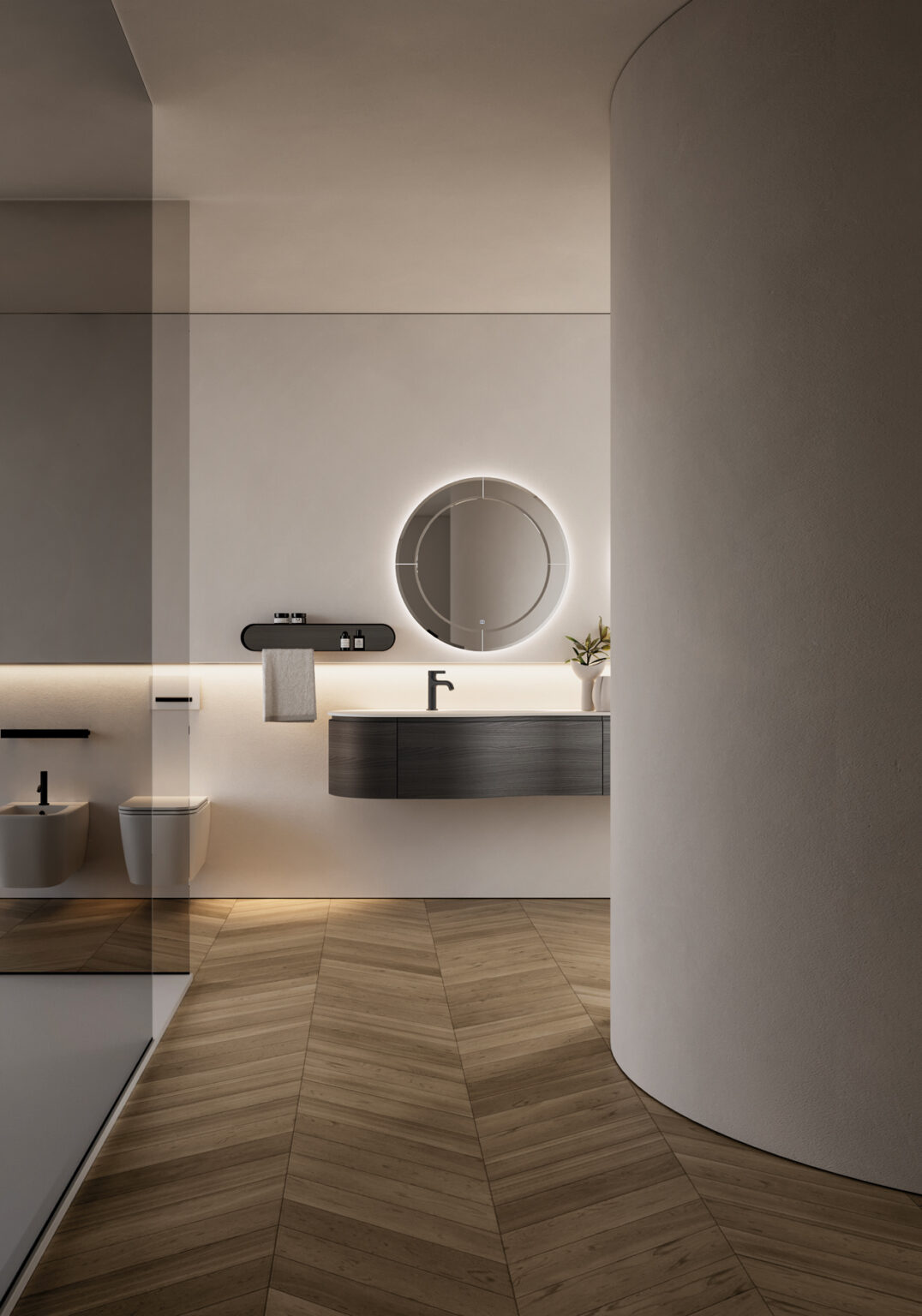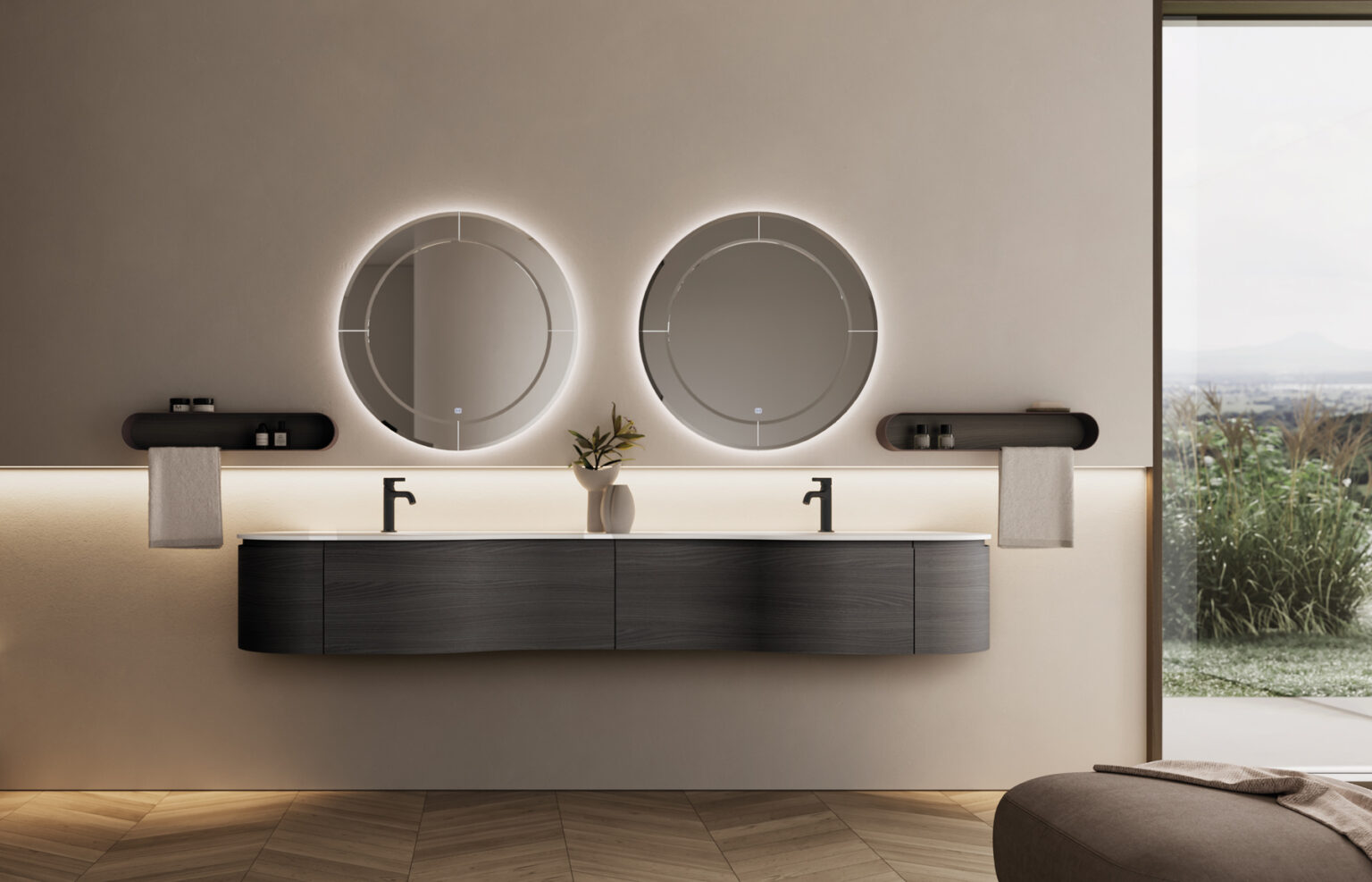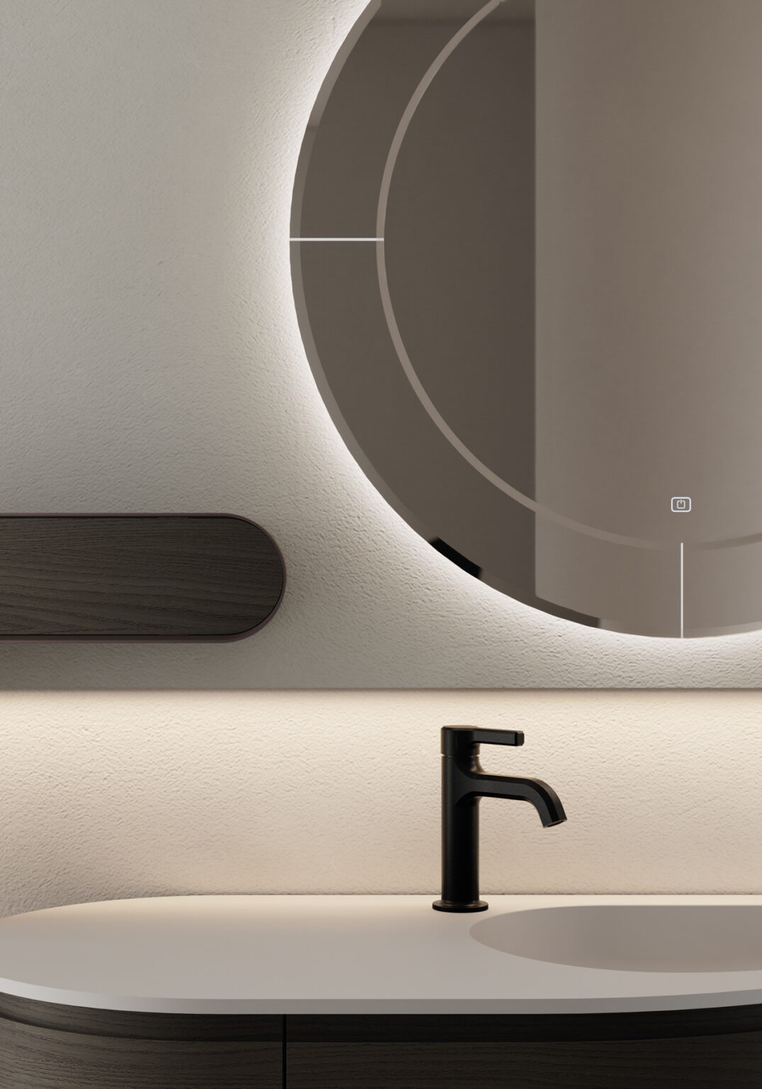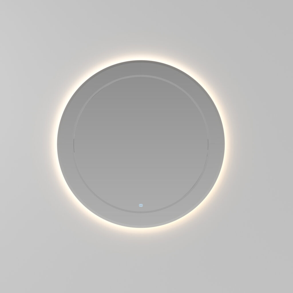 Miroir Marte avec bord du miroir biseauté sur tout le pourtour, avec rétroéclairage LED, muni d’un interrupteur tactile ON/OFF et température de couleur réglable de 2700 K à 6000 K. Non compatible avec d’autres lampes. IP44 De 17 à 25 W – de 1350 à 2100 Lm
