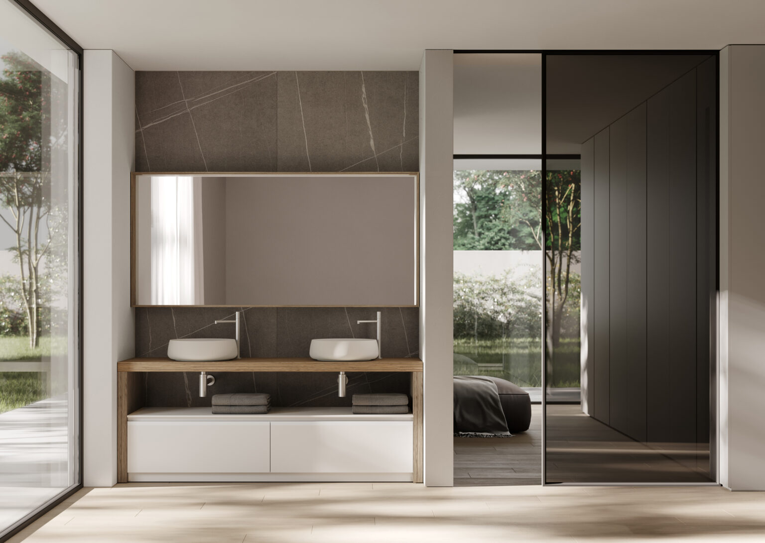 Miroir Nest avec cadre et éclairage LED intégré dans la partie supérieure. Il peut être complété par des étagères ouvertes encastrées de 70 cm de haut, placées à droite ou à gauche (sauf pour les versions de 62/72 cm de largeur). Prise rasoir et interrupteur non disponibles. IP44 – 4000 K De 10 à 33 W – de 660 à 2350 Lm