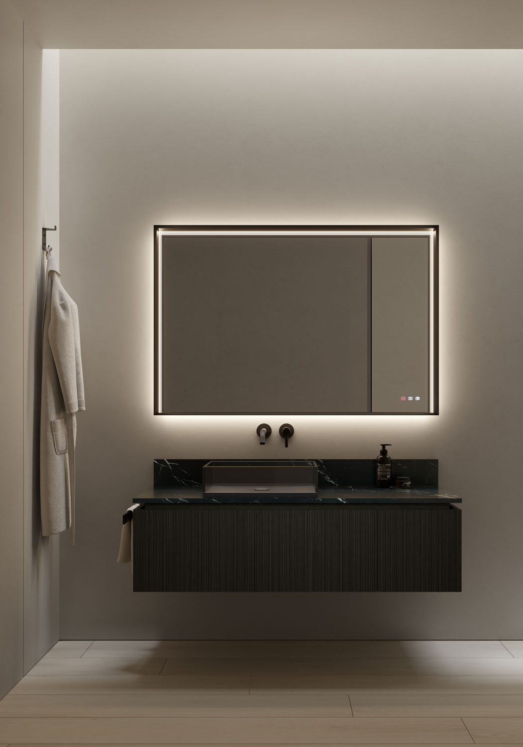 Miroir Pigreco rétroéclairé avec structure en aluminium, éclairage LED intégré sur 3 côtés et système anti-buée. Muni d’un interrupteur tactile ON/OFF. Température de couleur réglable de 2700 K à 4000 K. Prise rasoir non disponible. IP44 De 50 à 121 W – de 2052 à 4536 Lm