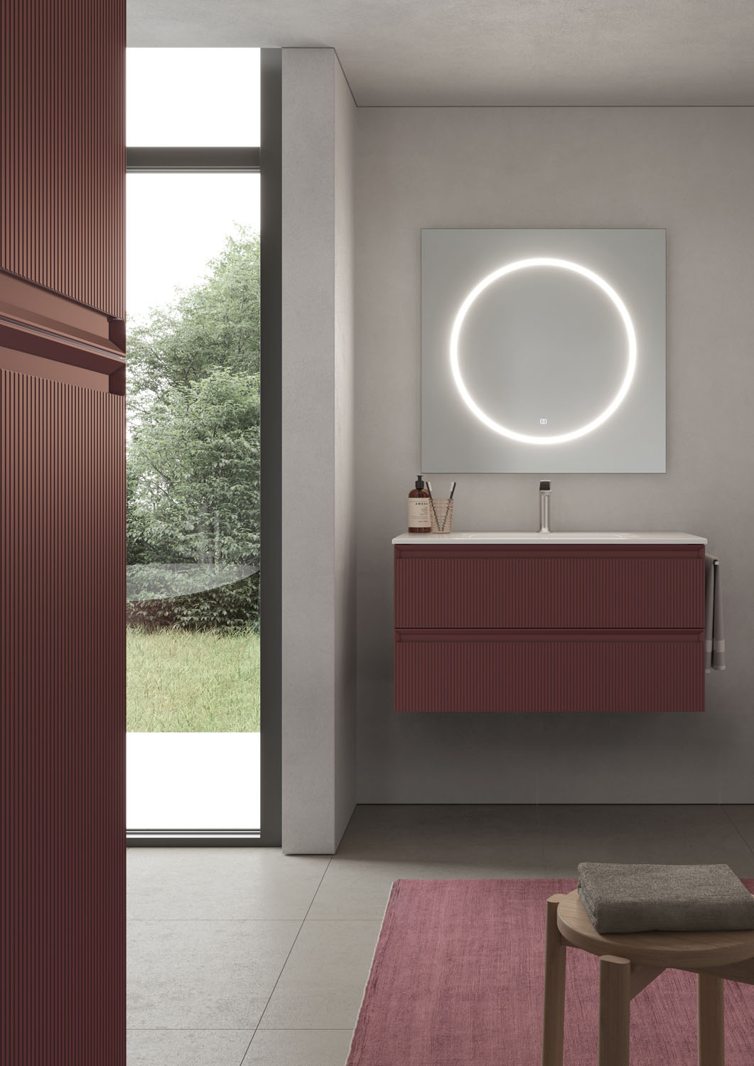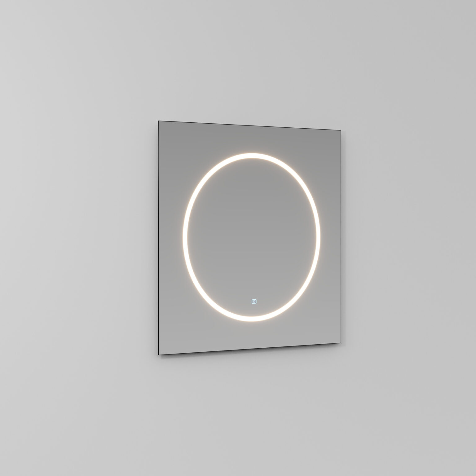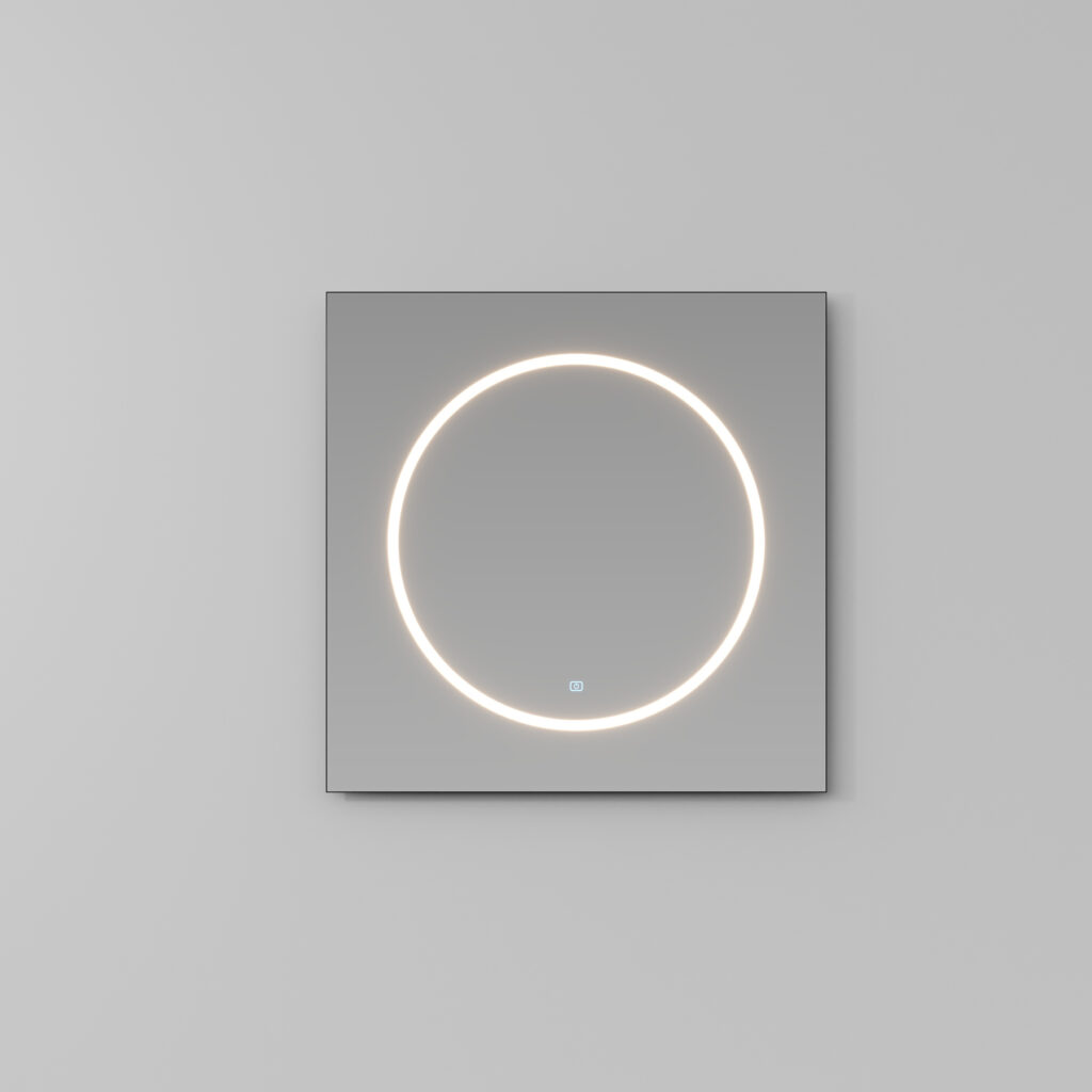 Miroir carré avec un cercle sérigraphié lumineux et bords ronds polis, disponible en une seule taille. Il est équipé d’un éclairage LED intégré dans le cercle sérigraphié, avec interrupteur tactile ON/OFF (température de couleur réglable de 2700 K à 6000 K). IP44 18 W – 2046 Lm