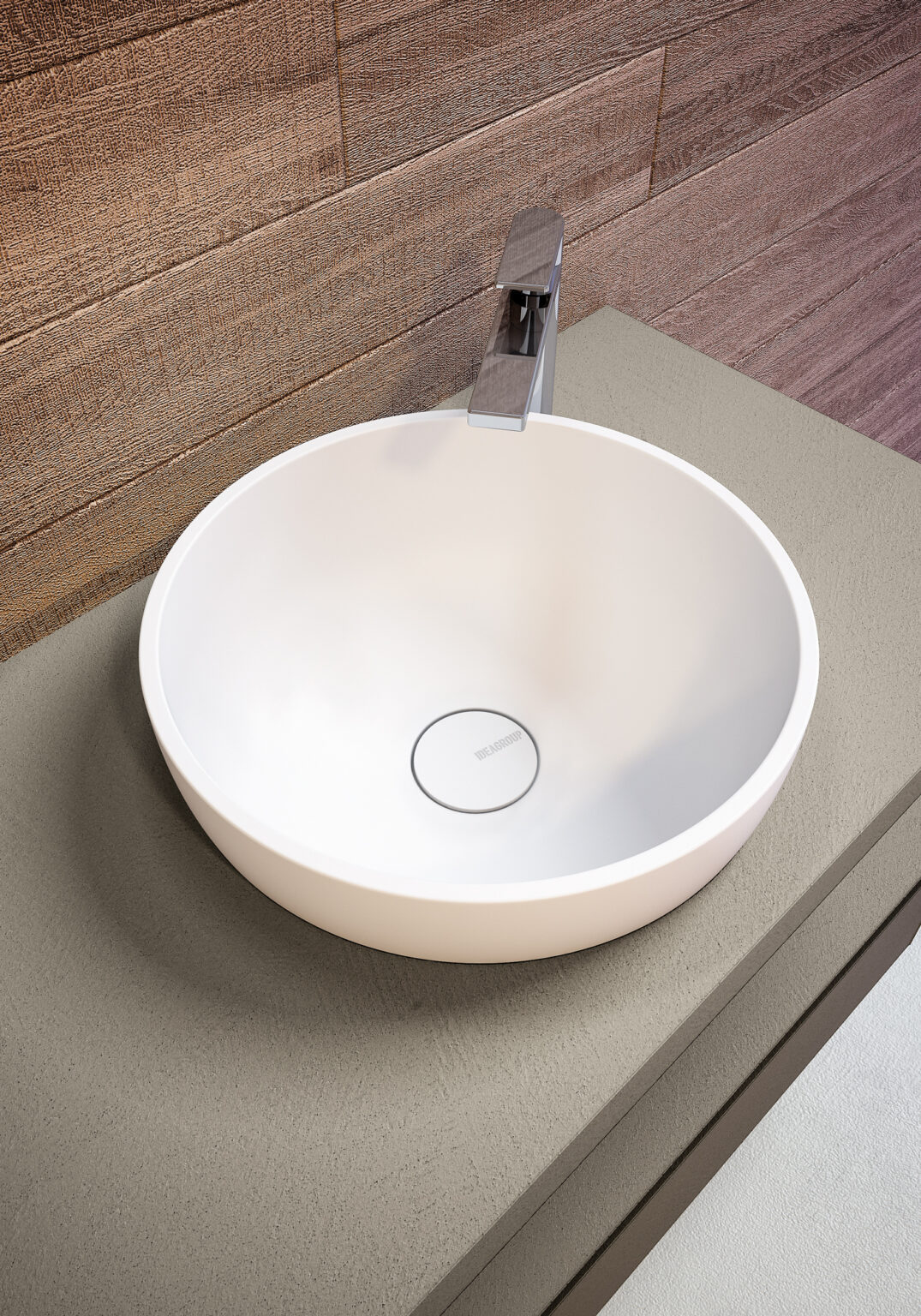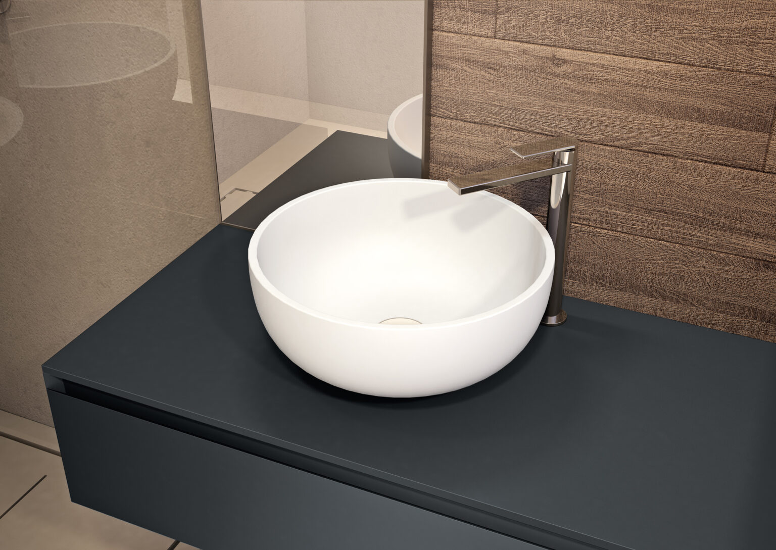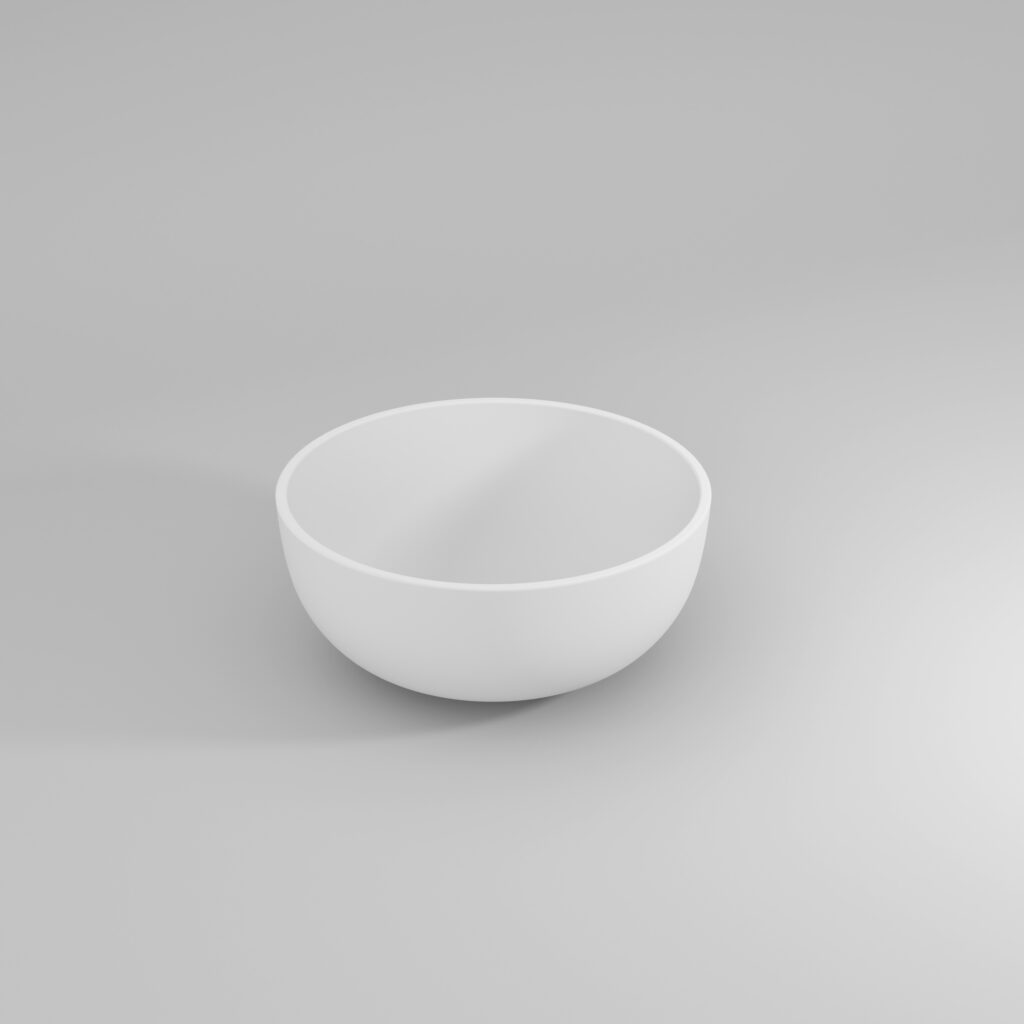 Vasque Bacinella à poser en Aquatek blanc mat. Sans trop-plein, munie de bonde de vidage toujours ouverte dans la même finition. Disponible pour plans de toilette linéaires avec profondeur 36 cm et 45,5 cm, et pour plans de toilette courbes.