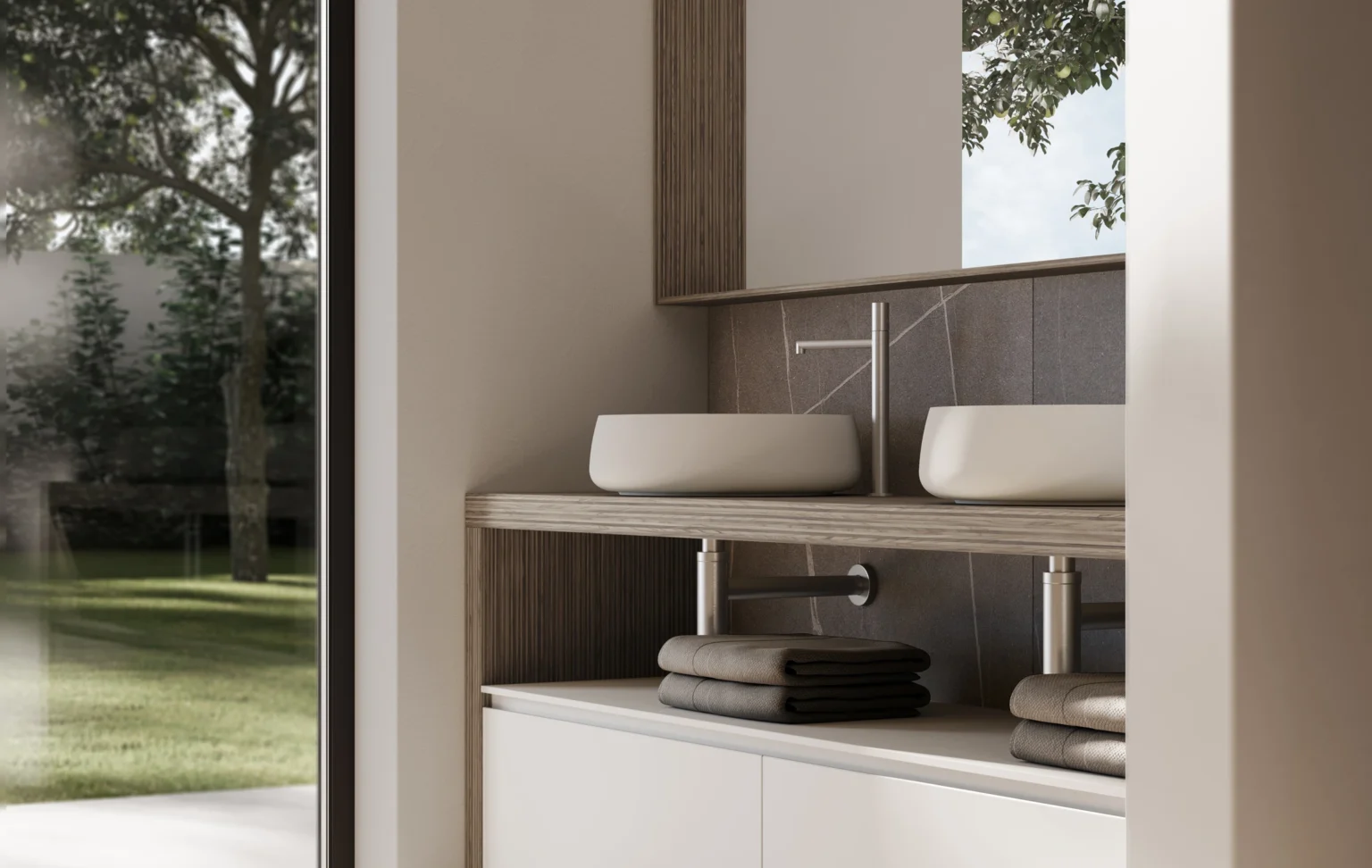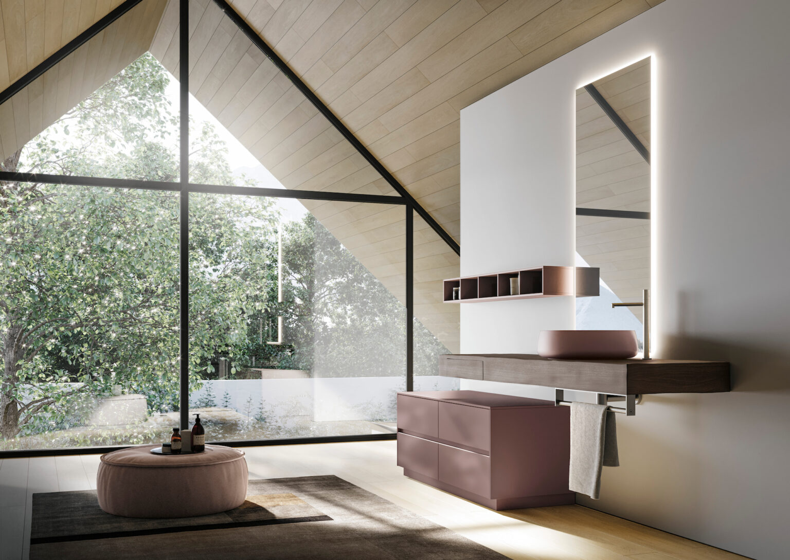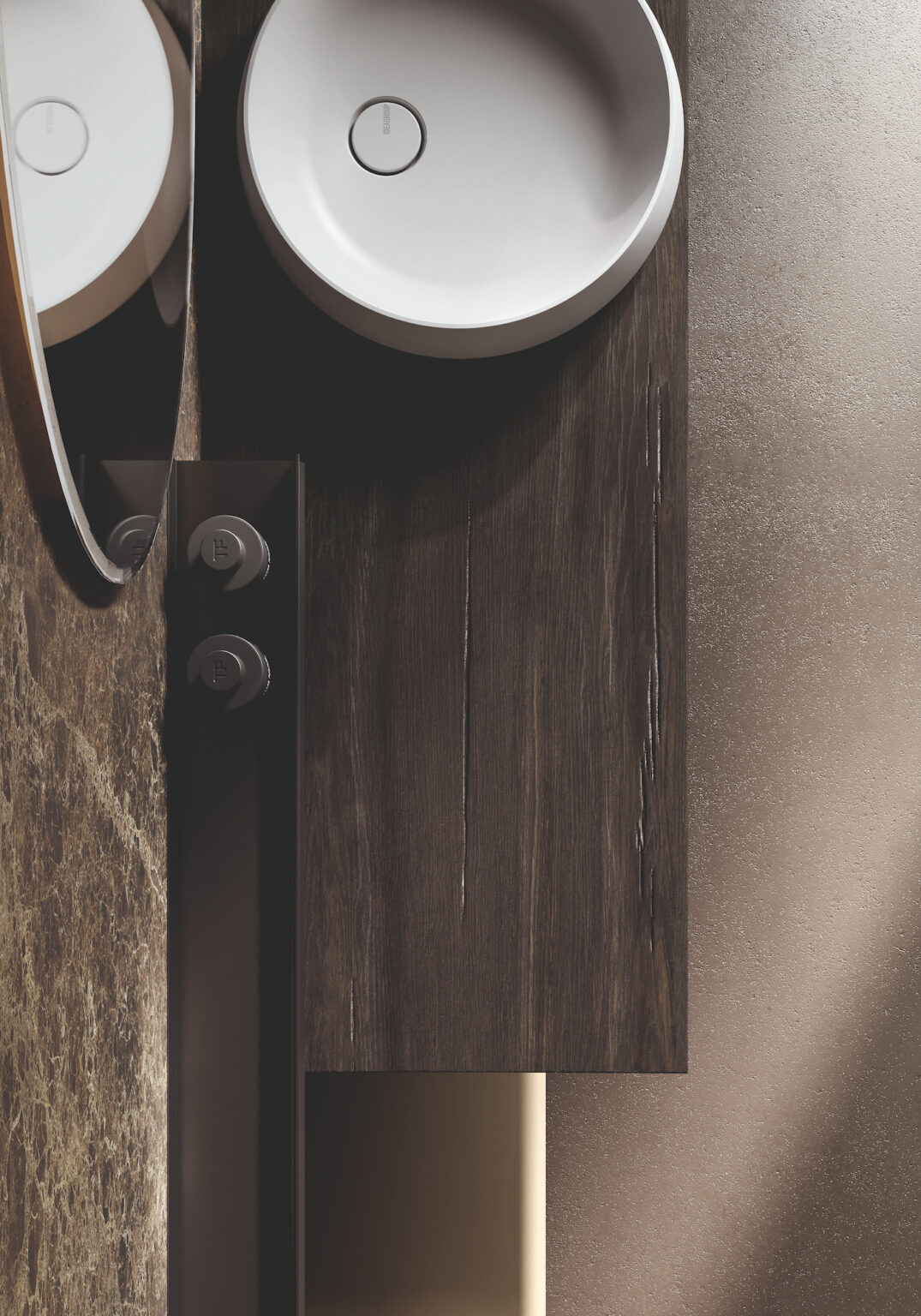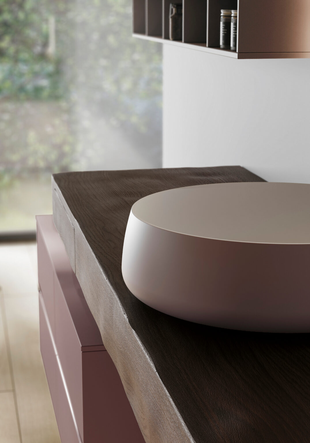 Vasque Beauty à poser sur le plan de toilette, en Cristalplant®. Disponible en blanc mat, colorée à l’extérieur ou colorée à l’intérieur et à l’extérieur dans les couleurs mates et Metal Color des nuanciers Ideagroup (les finitions Metal Color ne peuvent être appliquées que sur l’extérieur). Sans trop-plein. Disponible pour plans de toilette linéaires avec profondeur 36 et 45,5 cm.