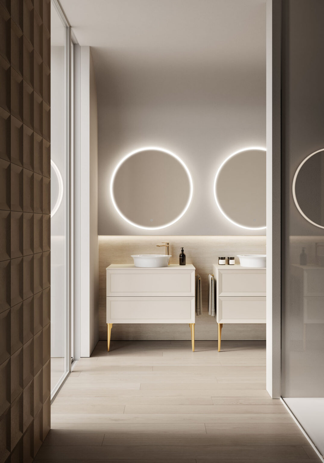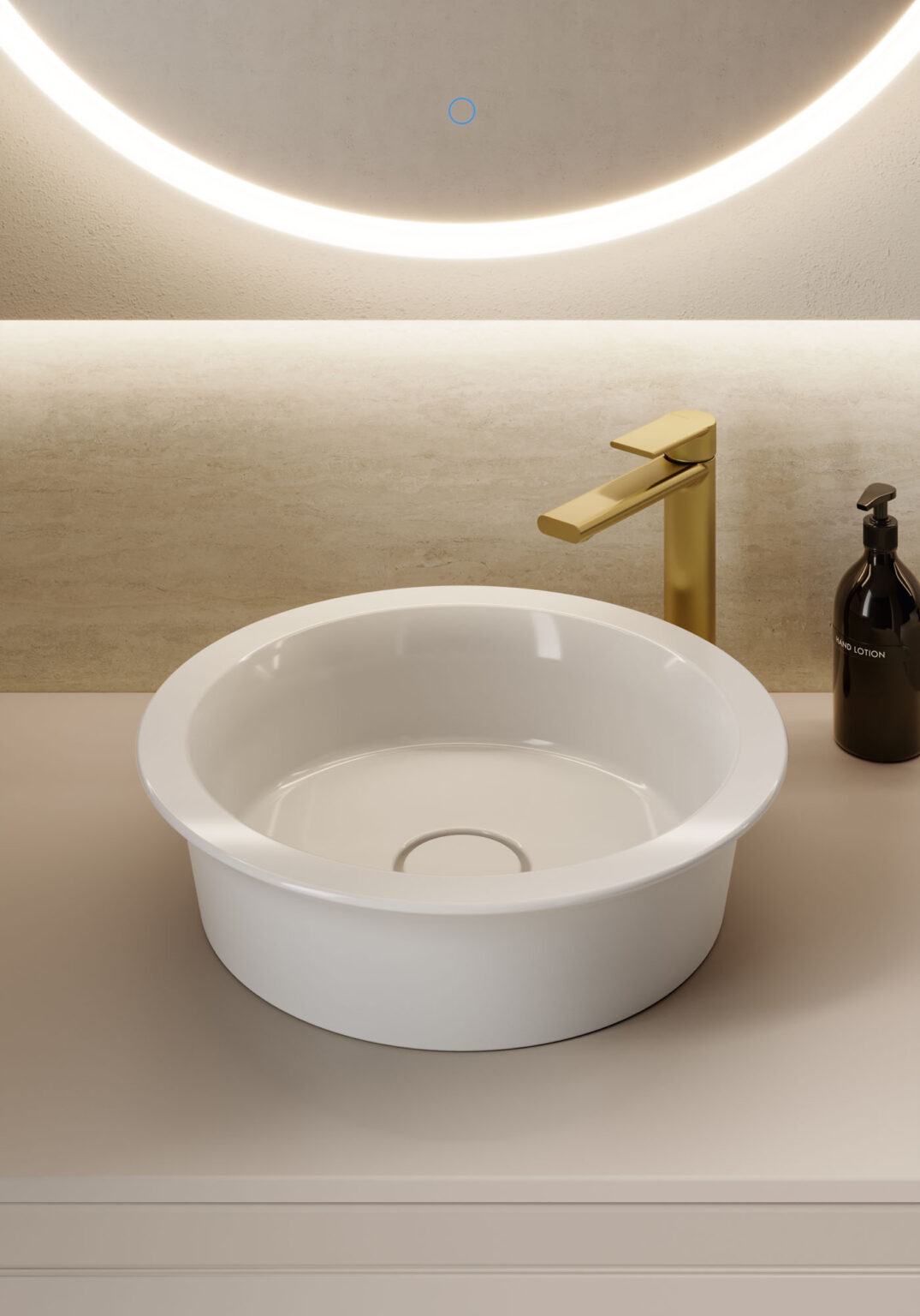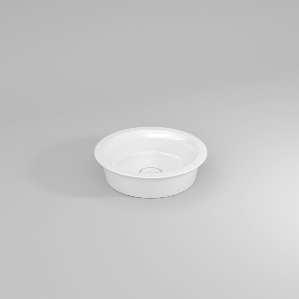 Vasque Berlino Tondo à poser sur le plan de toilette, en céramique blanche brillante, sans trop-plein. Disponible pour plans de toilette linéaires avec profondeur 45,5 cm.