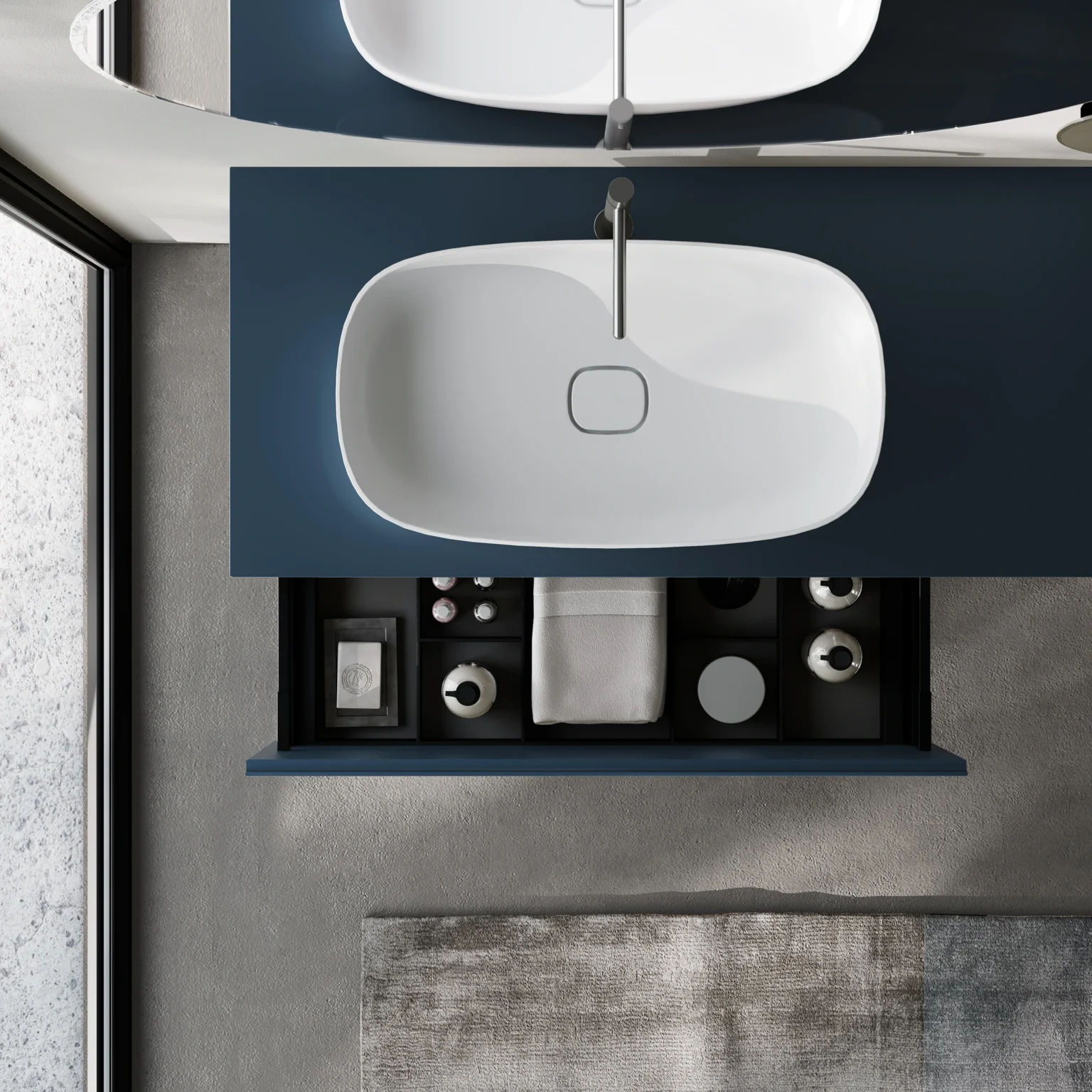 Vasque Click à poser en Mineralux blanc ou en Mineralsolid blanc. Sans trop-plein. Disponible pour plans de toilette linéaires avec profondeur 36 et 45,5 cm.