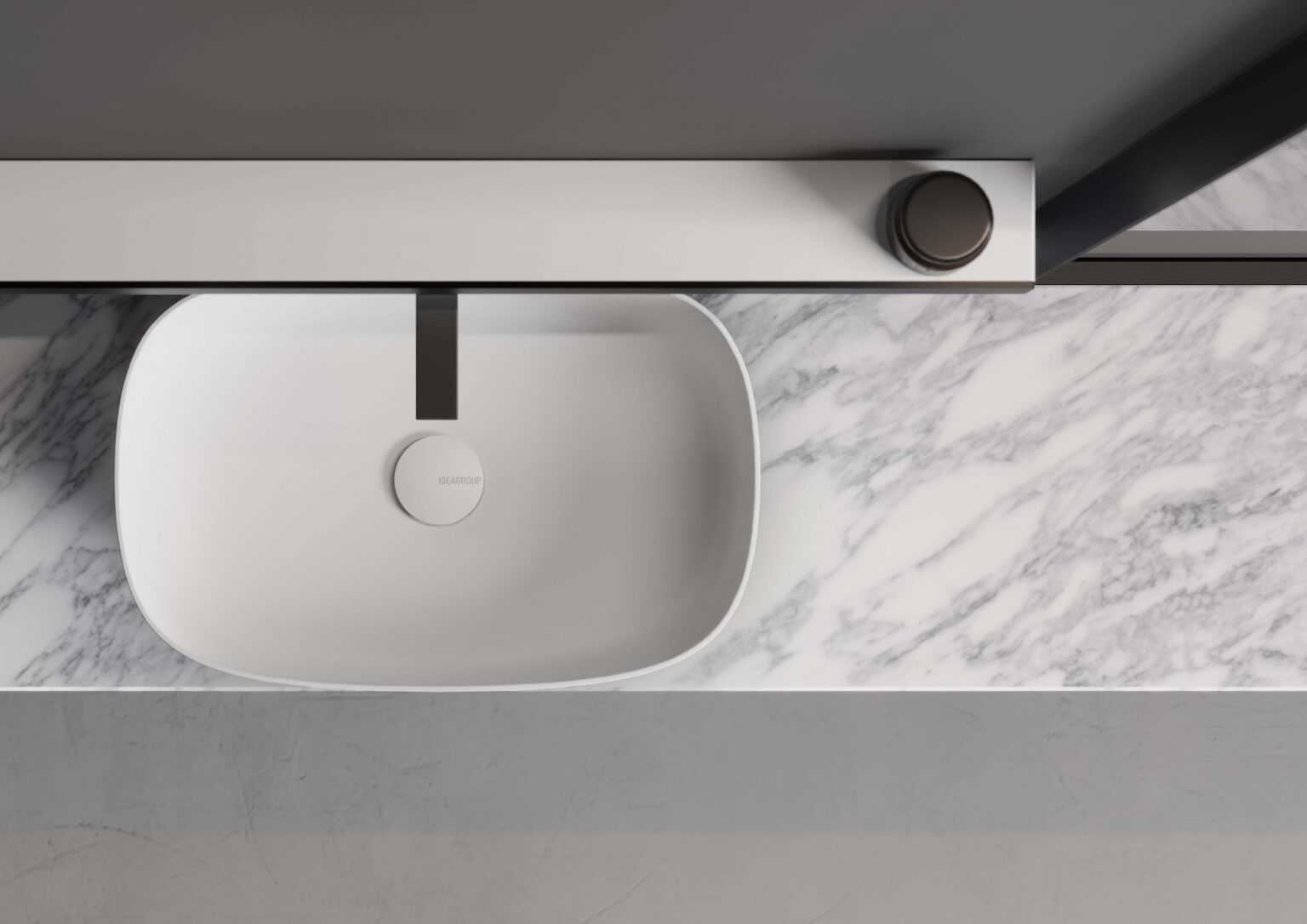 Vasque Laguna05 à poser sur le plan de toilette, en Cristalplant®. Disponible en blanc mat, colorée à l’extérieur ou colorée à l’intérieur et à l’extérieur dans les couleurs mates et Metal Color des nuanciers Ideagroup (les finitions Metal Color ne peuvent être appliquées que sur l’extérieur). Sans trop-plein. Disponible pour plans de toilette linéaires avec profondeur 36 et 45,5 cm.