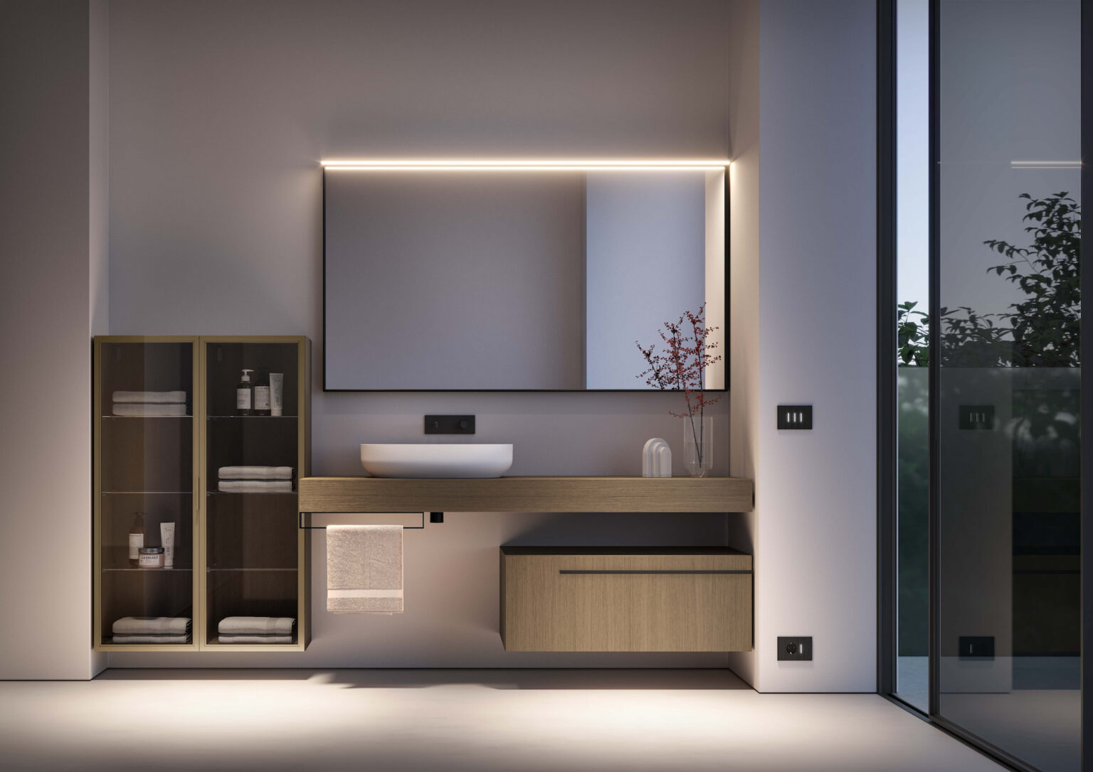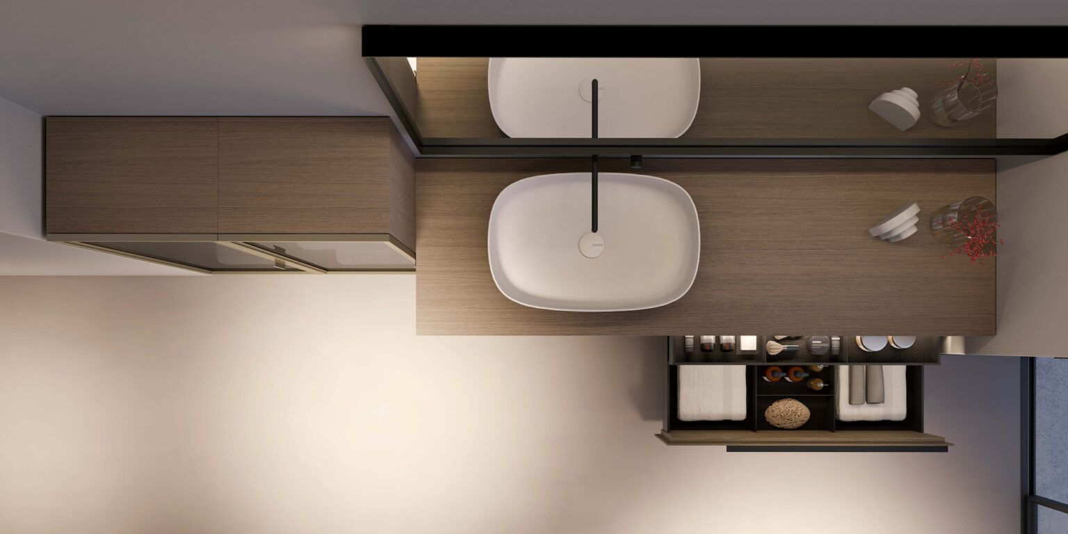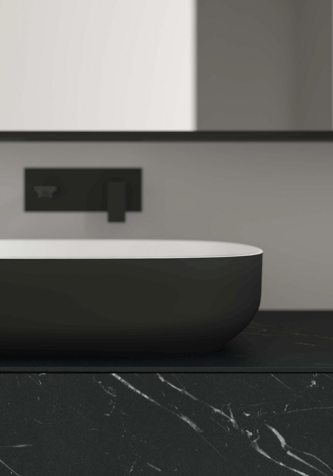 Vasque Laguna06 à poser sur le plan de toilette, en Cristalplant®. Disponible en blanc mat, colorée à l’extérieur ou colorée à l’intérieur et à l’extérieur dans les couleurs mates et Metal Color des nuanciers Ideagroup (les finitions Metal Color ne peuvent être appliquées que sur l’extérieur). Sans trop-plein. Disponible pour plans de toilette linéaires avec profondeur 36 et 45,5 cm.
