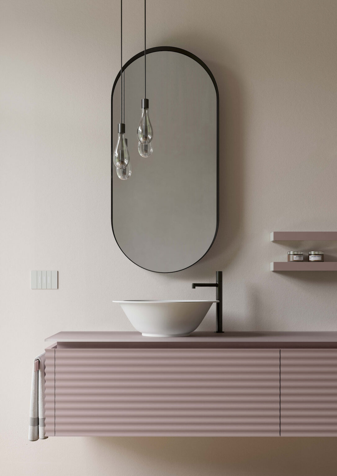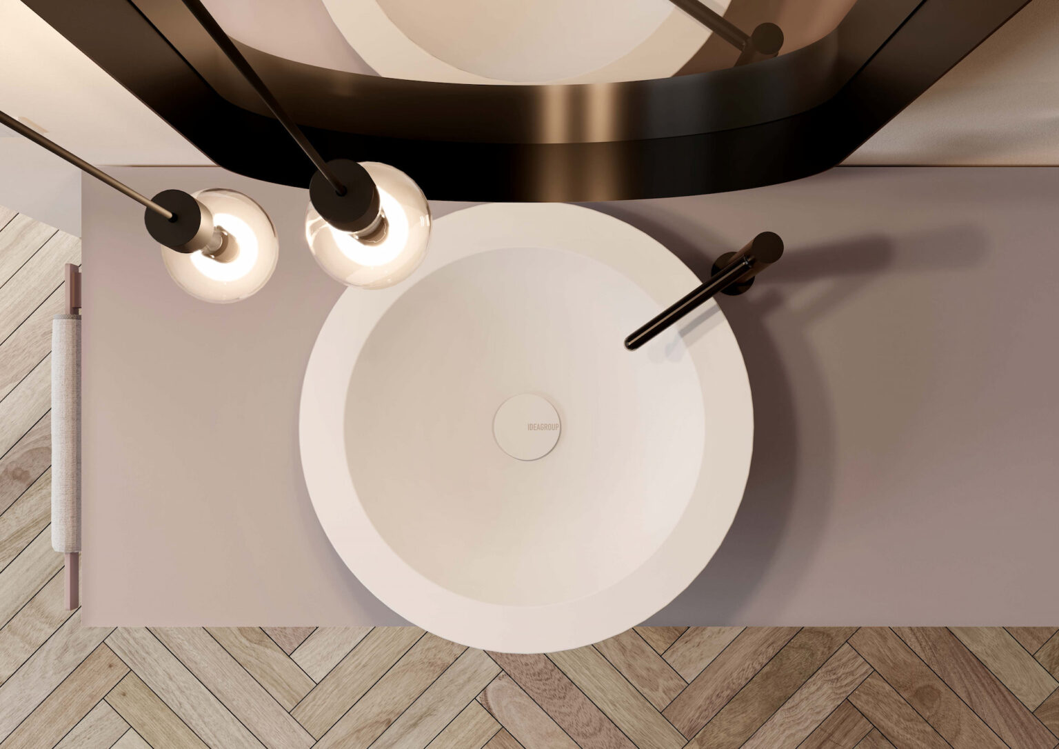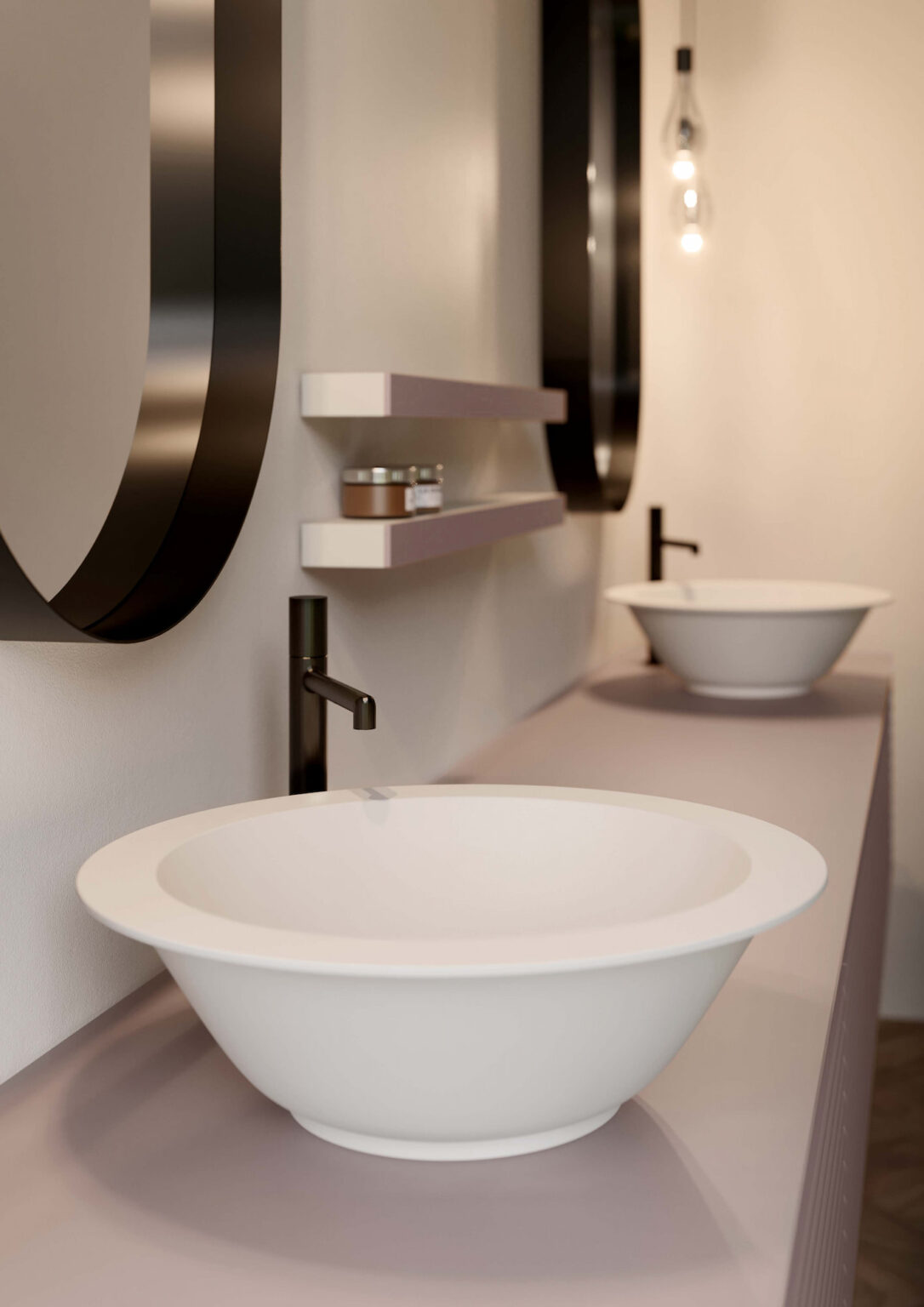 Vasque Marea à poser sur le plan de toilette, en céramique blanche brillante ou blanche mate. Sans trop-plein et munie de bonde de vidage toujours ouverte dans la même finition. Disponible pour plans de toilette linéaires avec profondeur 45,5 cm.