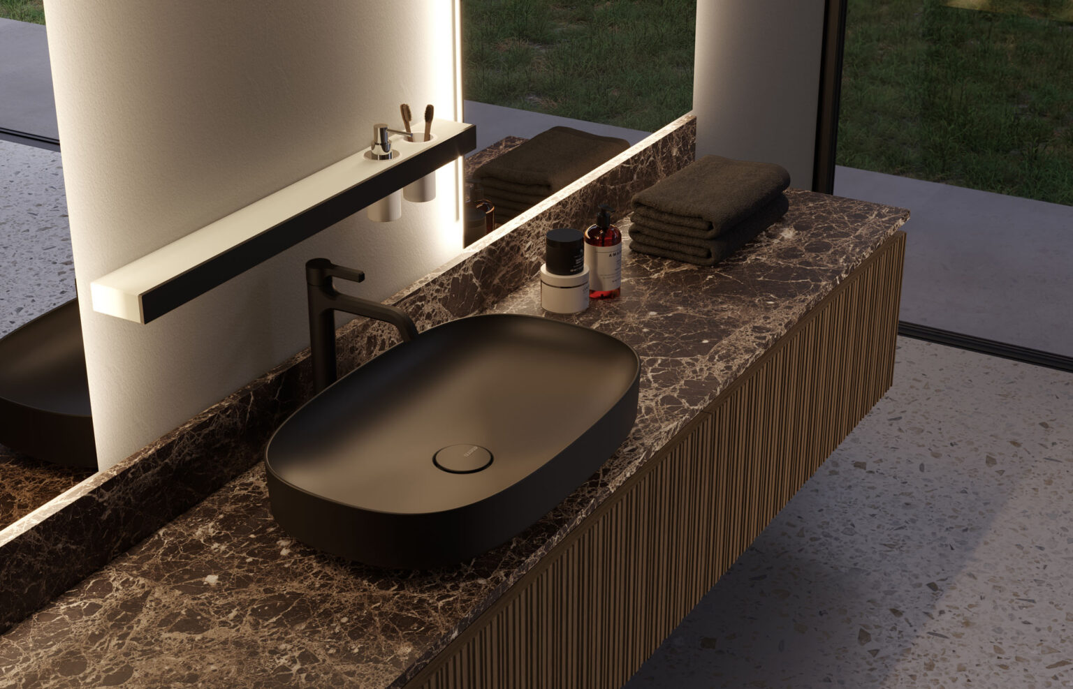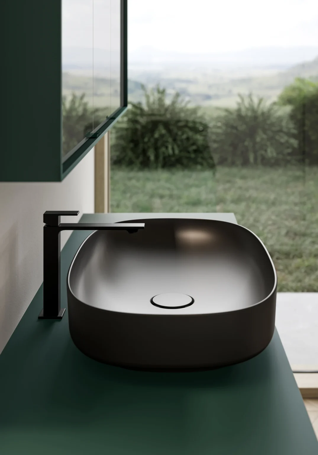 Vasque Pool à poser sur le plan de toilette, en céramique blanche brillante, blanche mate et noire mate, sans trop-plein. Disponible pour plans de toilette avec profondeur 36 et 45,5 cm.