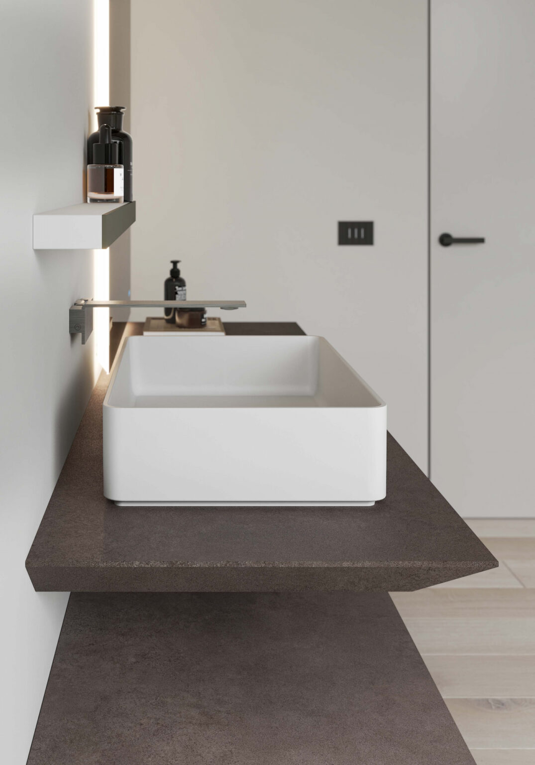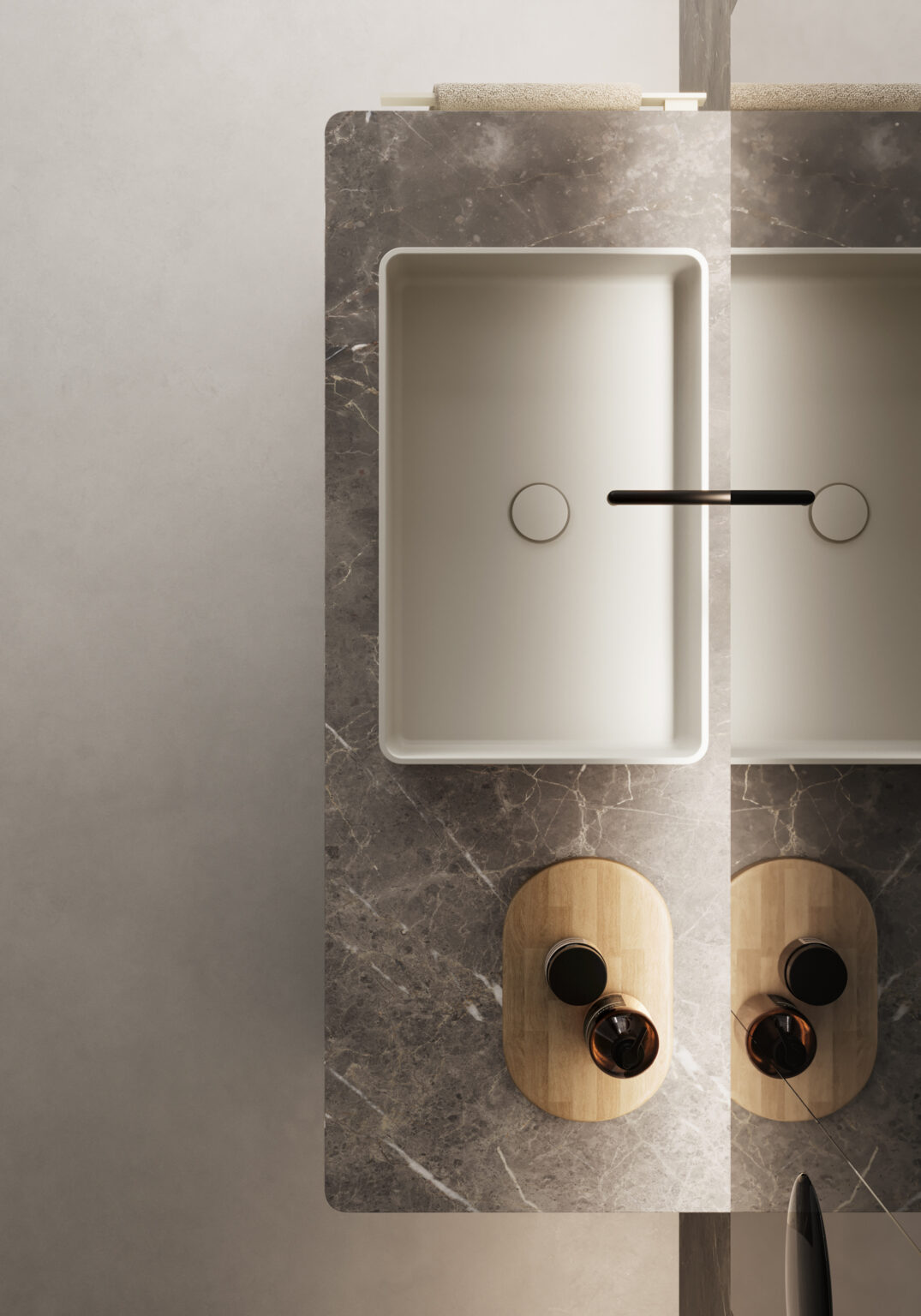 Vasque Riva06 à poser sur le plan de toilette, en Cristalplant®. Disponible en blanc mat, colorée à l’extérieur ou colorée à l’intérieur et à l’extérieur dans les couleurs mates et Metal Color des nuanciers Ideagroup (les finitions Metal Color ne peuvent être appliquées que sur l’extérieur). Sans trop-plein. Disponible pour plans de toilette linéaires avec profondeur 45,5 cm.