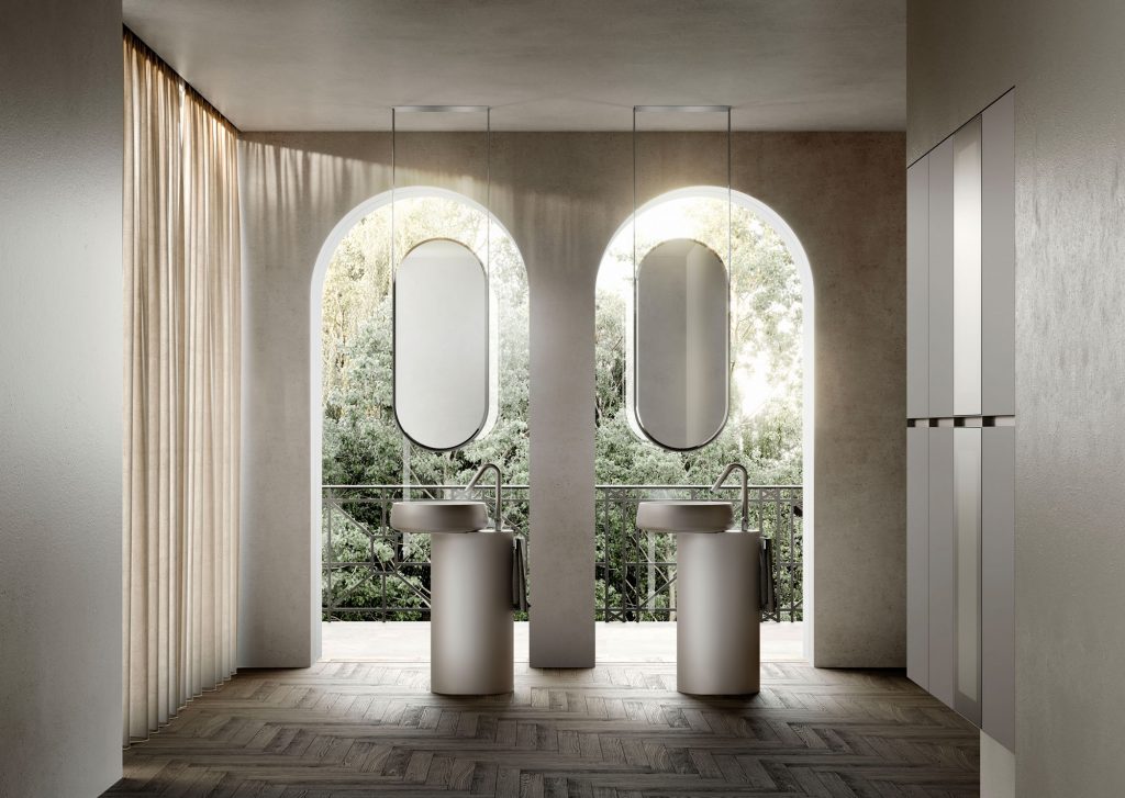 La collection se distingue dans son ensemble par son design linéaire, épuré et esthétiquement rigoureux. Les tiroirs et les portes se distinguent par leur conception sans poignée et leurs bords inclinés à 45° ; ils sont séparés par des rainures qui créent un jeu de lignes géométriques orthogonales en produisant un impact visuel minimaliste caractéristique des meubles de salle de bains modernes. La personnalisation joue un rôle fondamental : du choix de l’installation, avec un meuble posé au sol ou une base murale, à celui des matériaux et de leurs finitions, en ligne avec les tendances les plus actuelles de salles de bains modernes et de design.