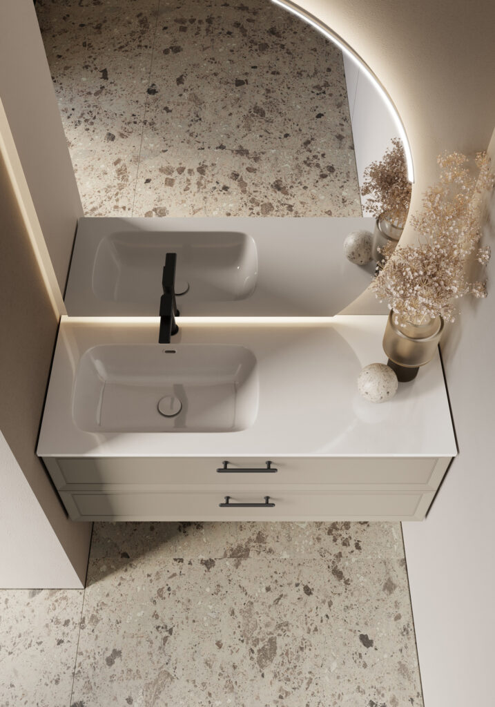 Un élément de design élégant et distinctif qui permet à un seul plan de toilette d’être caractérisé par différentes profondeurs pour répondre à des exigences spécifiques fonctionnelles ou d’espace (par exemple, si un compartiment lave-linge doit être installé sous le plan de toilette). Les plans de toilette à profondeur variable sont disponibles dans tous les matériaux de la liste de prix, à l’exception de la céramique et du polymère.