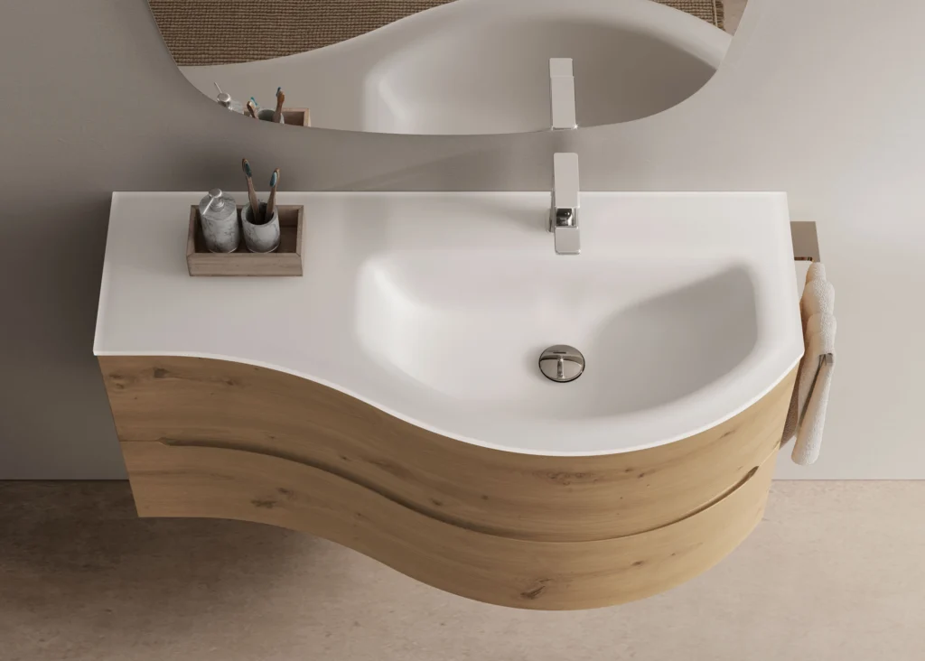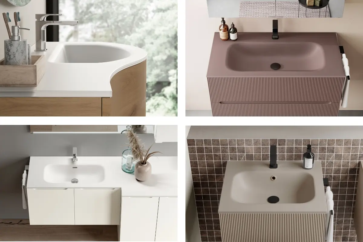 Les plans de toilette spécifiques en Verre, Mineralsolid e Mineralux également coloré complètent parfaitement les bases.