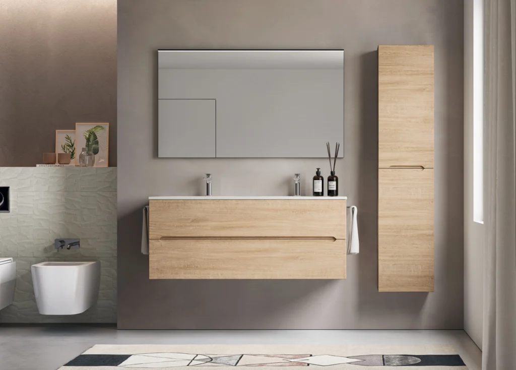 Six finitions polymères effet bois habillent la collection. L’orientation du veinage est différente entre les deux modèles : les meubles Smyle Plan présentent un veinage uniforme horizontal sur les façades et sur les côtés, tandis que les meubles Smyle Onda présentent un veinage vertical sur les façades et un veinage horizontal sur les côtés, qui ne sont pas cannelés.