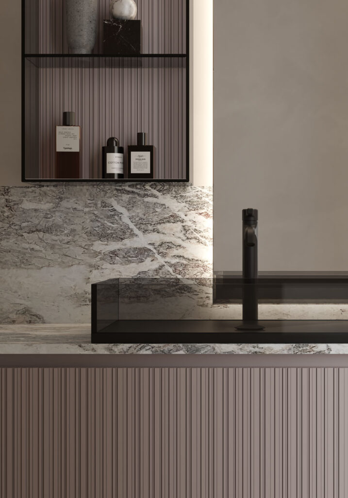 Une nouvelle vasque rectangulaire à poser, en verre Fumé brillant avec un fond en verre Nero mat, disponible en deux dimensions (50 cm ou 65 cm de large). Des étagères et des éléments ouverts assortis dans la même finition sont également disponibles.